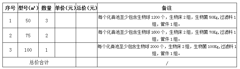 bw必威西汉姆联官方网站·尚含绿城化粪池采购工作。主要包括50m³化粪池3座、75m³化粪池2座、100m³化粪池1座。具体参数要求如下表: