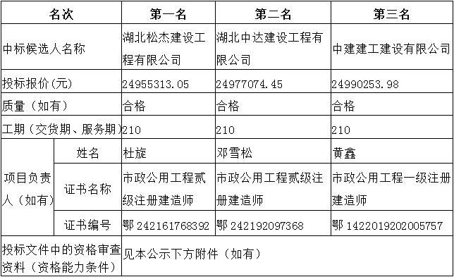松江花园安置小区(三期)及配套基础设施建设项目室外工程于2022年01月25日在湖北省电子招投标交易平台发布招标公告,2022年02月23日在松滋市开标室(2)开标,并于2022年02月23日完成评标工作。根据评标委员会提交的评标报告,湖北松滋金投置业有限公司已经确认评标结果,现进行评标结果公示。