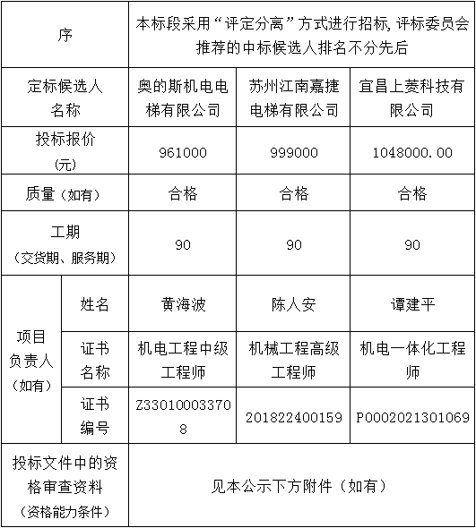 金投•彩虹湾一期(S1号楼综合商业)及配套工程金投•彩虹湾(一期S1#楼综合商业)电梯采购及安装项目于2023年11月14日在湖北省电子招投标交易平台发布招标公告,2023年12月11日在松滋市开标室(2)开标,并于2023年12月11日完成评标工作。根据评标委员会提交的评标报告,湖北松滋金投置业有限公司已经确认评标结果,现进行评标结果公示。