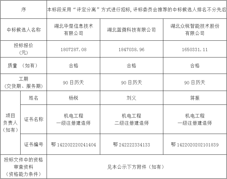 金投•新城臻品金投•新城臻品建设项目弱电智能化工程于2024年01月26日在湖北省电子招投标交易平台发布招标公告,2024年02月27日在松滋市开标室(2)开标,并于2024年02月27日完成评标工作。根据评标委员会提交的评标报告,湖北松滋金投置业有限公司已经确认评标结果,现进行评标结果公示。