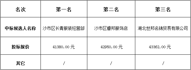 金投物业员工工作服装采购项目于2018年12月3日发布询价邀请函,2018年12月7日在松滋市稻谷溪城市湿地公园会议室进行评标。根据评标小组提交的评标结论,湖北金投物业管理有限公司已经确认评标结果,现进行中标候选人公示。