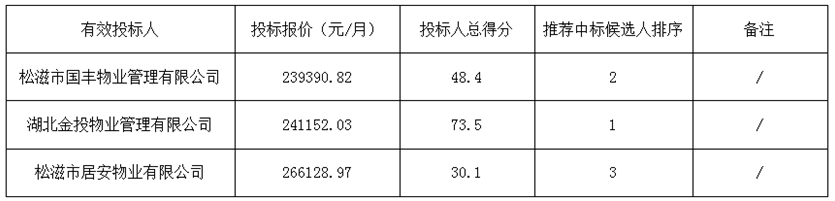 bw必威西汉姆联官方网站•尚含绿城前期物业服务项目于2019年08月04日在松滋新闻网(网址:http://www.songzinews.net)(媒介名称)上发布招标公告,2019年09月11日在松滋市乐乡凯瑞大酒店五楼会议室开标,并于2019年09月11日完成评标工作。根据评标委员会提交的评标报告,湖北松滋金投置业有限公司已经确认评标结果,现进行评标结果公示。